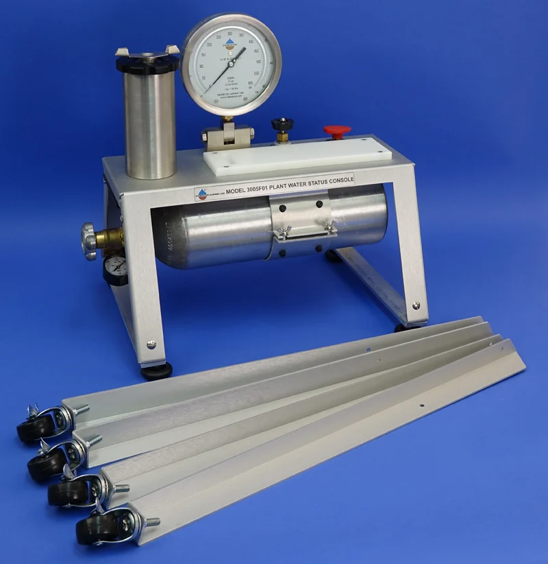 O Console de Potencial Hídrico de Planta de Mesa 3000 também é conhecido como Câmara de Pressão Scholander, Bomba de Pressão ou Console de Status Hídrico de Planta.